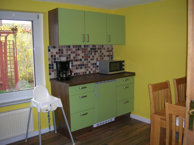 Komplett ausgestattete Einbauküche mit Mikrowelle, Spülmaschine, Kühlschrank und